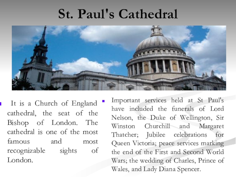 Important services held at St Paul's have included the funerals of Lord Nelson, the Duke of Wellington, Sir Winston Churchill and Margaret Thatcher; Jubilee celebrations for Queen Victoria; peace services marking the end of the First and Second World Wars; the wedding of Charles, Prince of Wales, and Lady Diana Spencer.