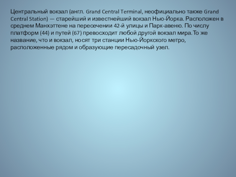 Слайд 51Центральный вокзал (англ. Grand Central Terminal, неофициально также Grand Central Station)