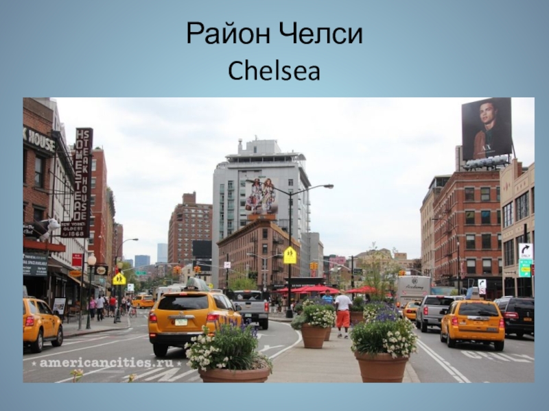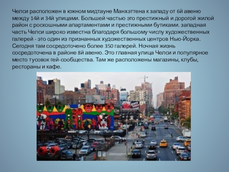 Слайд 34Челси расположен в южном мидтауне Манхэттена к западу от 6й авеню