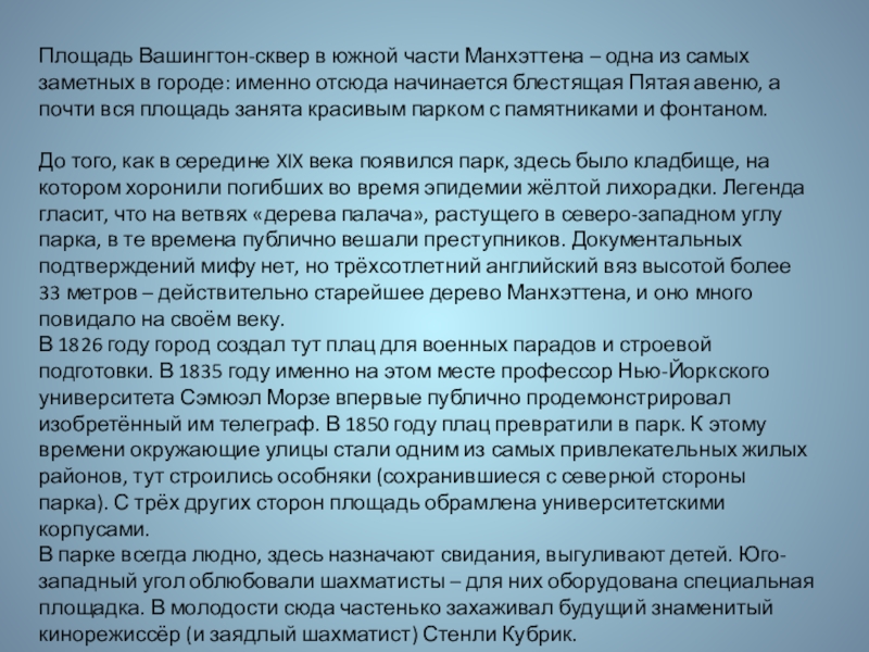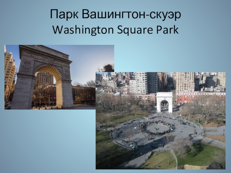 Слайд 32Площадь Вашингтон-сквер в южной части Манхэттена – одна из самых заметных