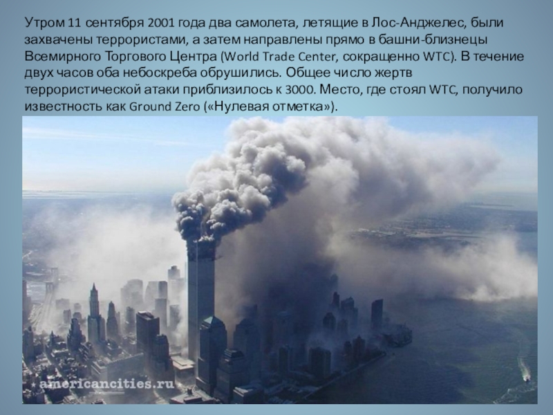 захвачены террористами, а затем направлены прямо в башни-близнецы Всемирного Торгового Центра (World Trade Center, сокращенно WTC). В течение двух часов оба небоскреба обрушились. Общее число жертв террористической атаки приблизилось к 3000. Место, где стоял WTC, получило известность как Ground Zero («Нулевая отметка»).
