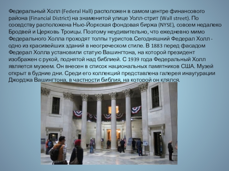 District) на знаменитой улице Уолл-стрит (Wall street). По соседству расположена Нью-Йоркская фондовая биржа (NYSE), совсем недалеко Бродвей и Церковь Троицы. Поэтому неудивительно, что ежедневно мимо Федерального Холла проходят толпы туристов.Сегодняшний Федерал Холл - одно из красивейших зданий в неогреческом стиле. В 1883 перед фасадом Федерал Холла установили статую Вашингтона, на которой президент изображен с рукой, поднятой над библией. С 1939 года Федеральный Холл является музеем. Он внесен в список национальных памятников США. Музей открыт в будние дни. Среди его коллекций представлена галерея инаугурации Джорджа Вашингтона, в частности библия, на которой он клялся.