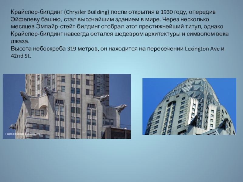 стал высочайшим зданием в мире. Через несколько месяцев Эмпайр-стейт-билдинг отобрал этот престижнейший титул, однако Крайслер-билдинг навсегда остался шедевром архитектуры и символом века джаза.