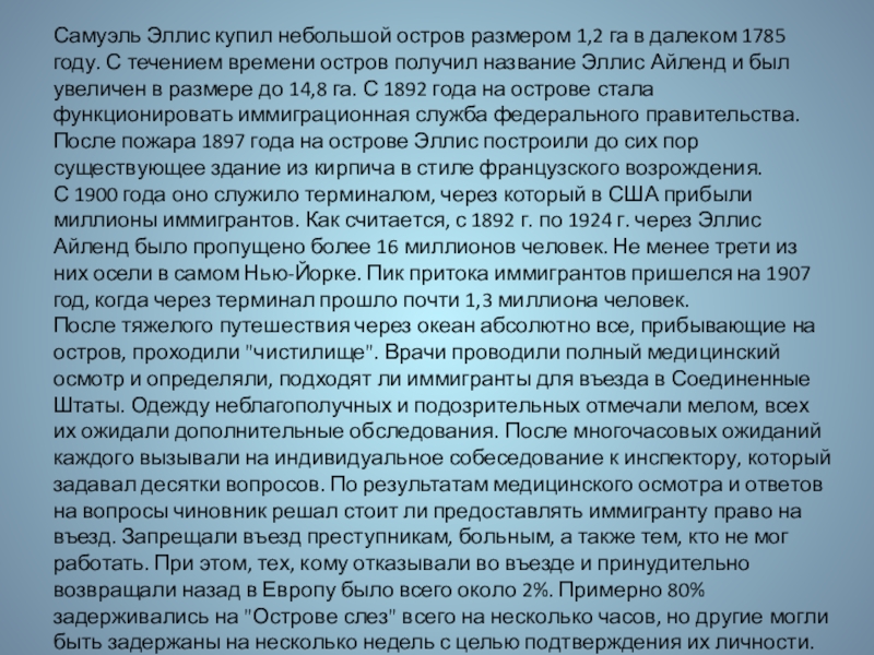 году. С течением времени остров получил название Эллис Айленд и был увеличен в размере до 14,8 га. С 1892 года на острове стала функционировать иммиграционная служба федерального правительства. После пожара 1897 года на острове Эллис построили до сих пор существующее здание из кирпича в стиле французского возрождения.