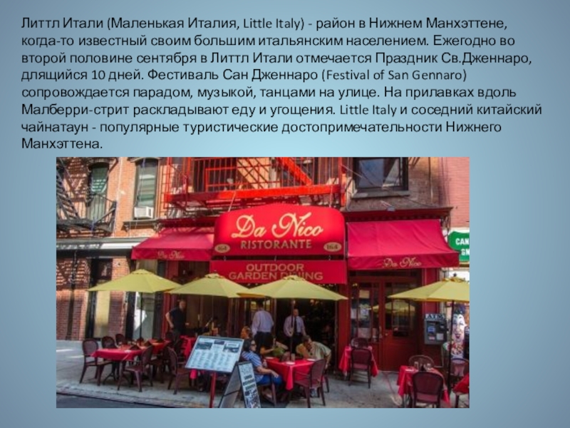 Слайд 23Литтл Итали (Маленькая Италия, Little Italy) - район в Нижнем Манхэттене,