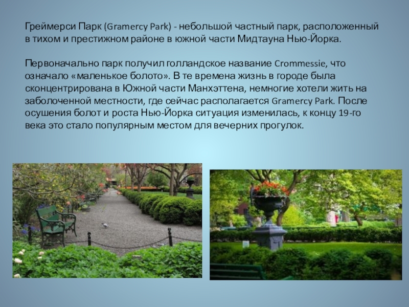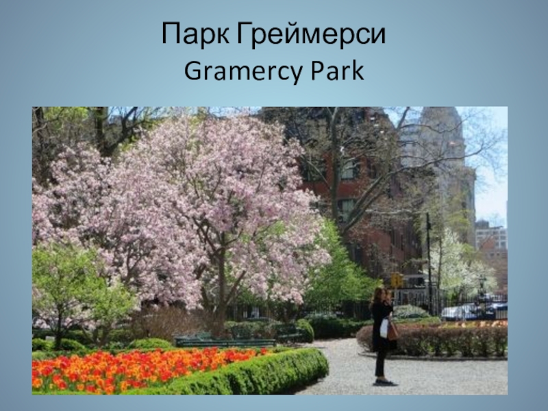 Слайд 36Греймерси Парк (Gramercy Park) - небольшой частный парк, расположенный в тихом