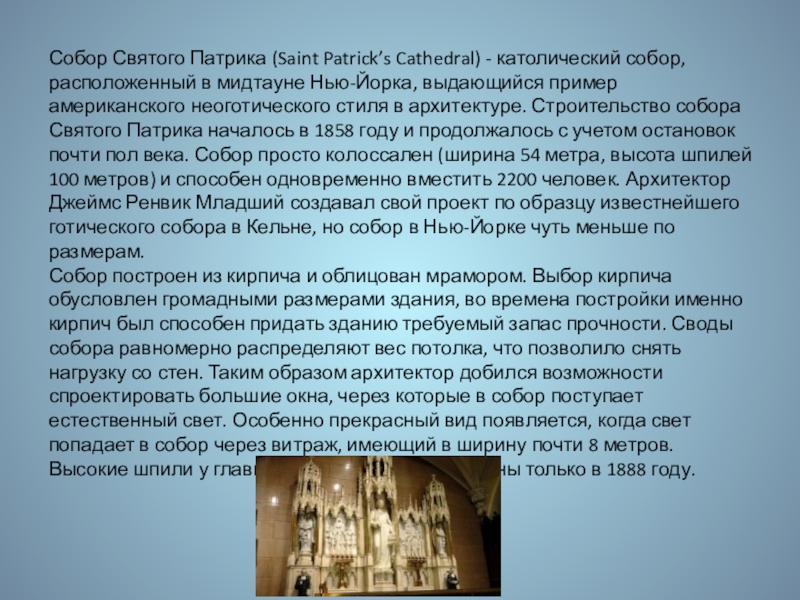мидтауне Нью-Йорка, выдающийся пример американского неоготического стиля в архитектуре. Строительство собора Святого Патрика началось в 1858 году и продолжалось с учетом остановок почти пол века. Собор просто колоссален (ширина 54 метра, высота шпилей 100 метров) и способен одновременно вместить 2200 человек. Архитектор Джеймс Ренвик Младший создавал свой проект по образцу известнейшего готического собора в Кельне, но собор в Нью-Йорке чуть меньше по размерам.