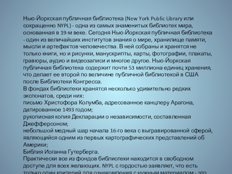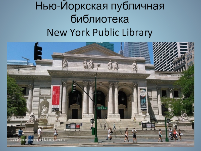 Слайд 42Нью-Йоркская публичная библиотека (New York Public Library или сокращенно NYPL) -