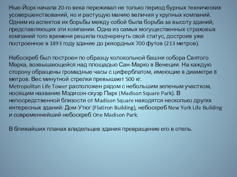 но и растущую манию величия у крупных компаний. Одним из аспектов их борьбы между собой была борьба за высоту зданий, представляющих эти компании. Одна из самых могущественных страховых компаний того времени решила подчеркнуть свой статус, достроив уже построенное в 1893 году здание до рекордных 700 футов (213 метров).