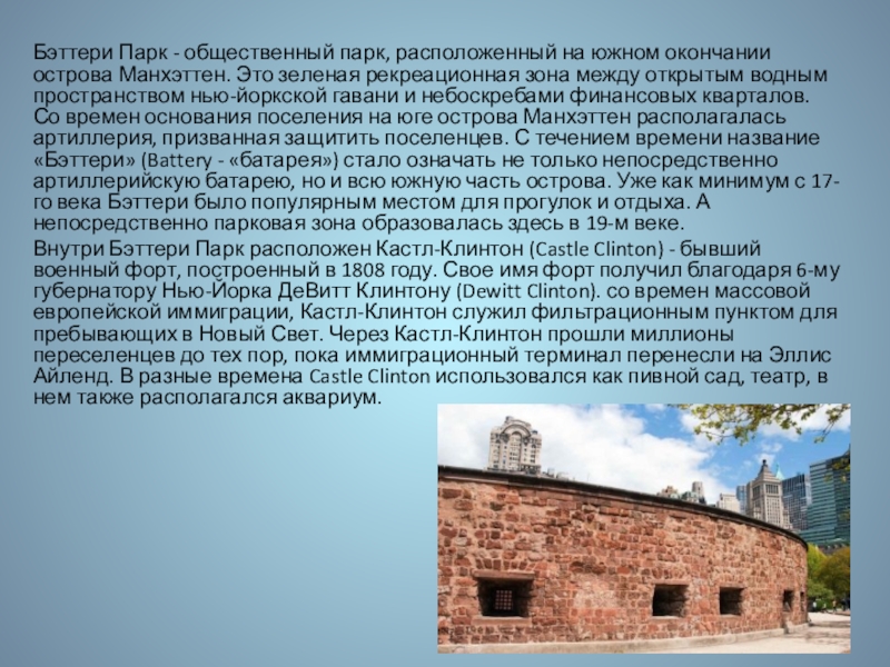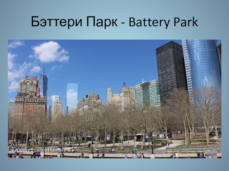 Слайд 9Бэттери Парк - общественный парк, расположенный на южном окончании острова Манхэттен.