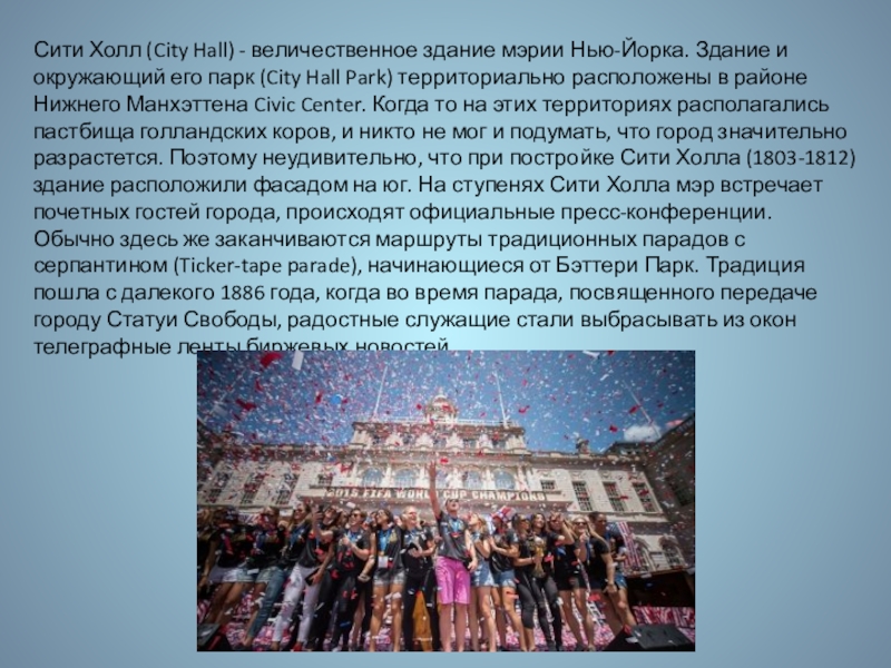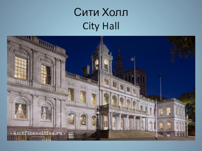 Слайд 15Сити Холл (City Hall) - величественное здание мэрии Нью-Йорка. Здание и