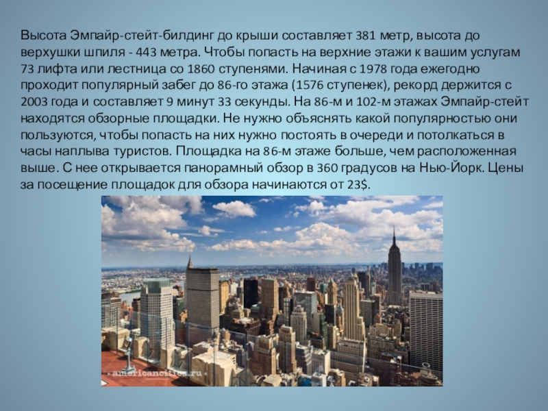 Слайд 47Высота Эмпайр-стейт-билдинг до крыши составляет 381 метр, высота до верхушки шпиля