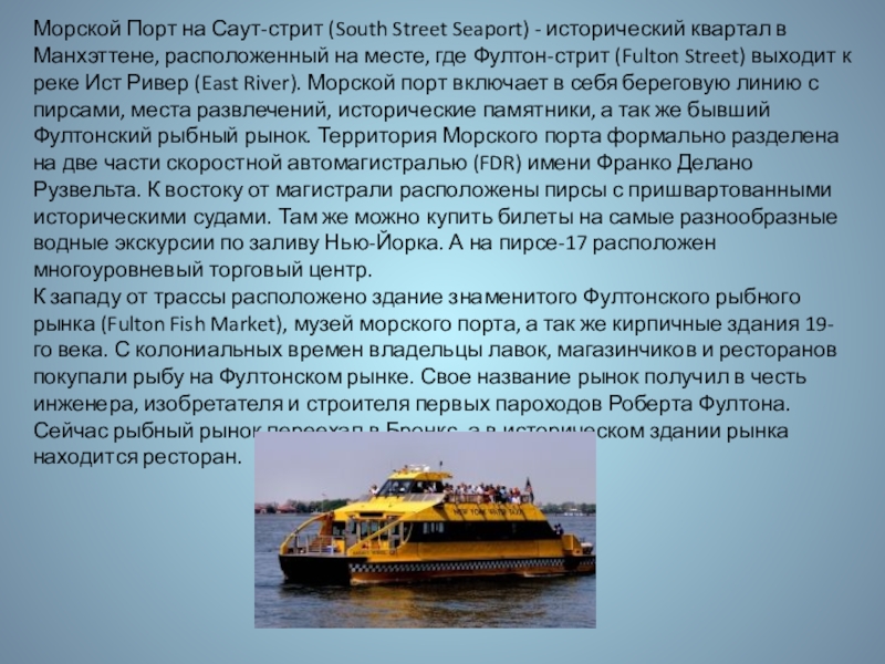 Манхэттене, расположенный на месте, где Фултон-стрит (Fulton Street) выходит к реке Ист Ривер (East River). Морской порт включает в себя береговую линию с пирсами, места развлечений, исторические памятники, а так же бывший Фултонский рыбный рынок. Территория Морского порта формально разделена на две части скоростной автомагистралью (FDR) имени Франко Делано Рузвельта. К востоку от магистрали расположены пирсы с пришвартованными историческими судами. Там же можно купить билеты на самые разнообразные водные экскурсии по заливу Нью-Йорка. А на пирсе-17 расположен многоуровневый торговый центр.