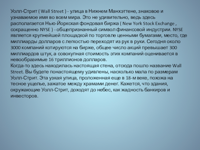 Слайд 5Уолл-Стрит ( Wall Street ) - улица в Нижнем Манхэттене, знаковое