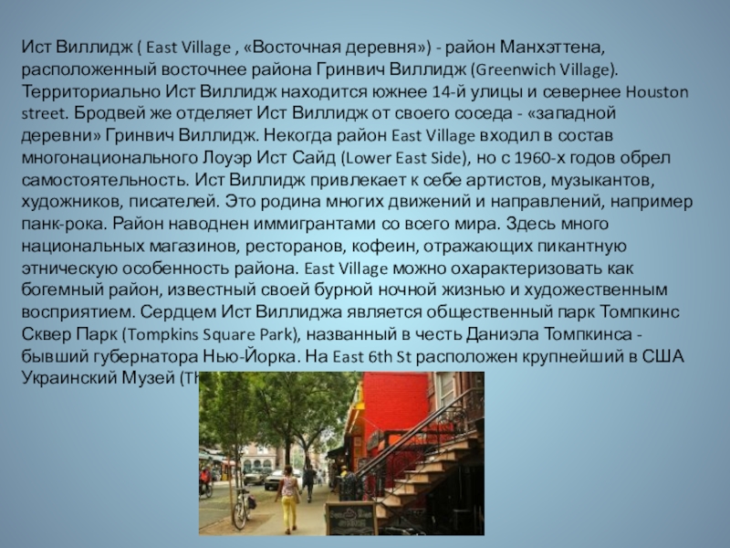 расположенный восточнее района Гринвич Виллидж (Greenwich Village). Территориально Ист Виллидж находится южнее 14-й улицы и севернее Houston street. Бродвей же отделяет Ист Виллидж от своего соседа - «западной деревни» Гринвич Виллидж. Некогда район East Village входил в состав многонационального Лоуэр Ист Сайд (Lower East Side), но с 1960-х годов обрел самостоятельность. Ист Виллидж привлекает к себе артистов, музыкантов, художников, писателей. Это родина многих движений и направлений, например панк-рока. Район наводнен иммигрантами со всего мира. Здесь много национальных магазинов, ресторанов, кофеин, отражающих пикантную этническую особенность района. East Village можно охарактеризовать как богемный район, известный своей бурной ночной жизнью и художественным восприятием. Сердцем Ист Виллиджа является общественный парк Томпкинс Сквер Парк (Tompkins Square Park), названный в честь Даниэла Томпкинса - бывший губернатора Нью-Йорка. На East 6th St расположен крупнейший в США Украинский Музей (The Ukranian Museum).