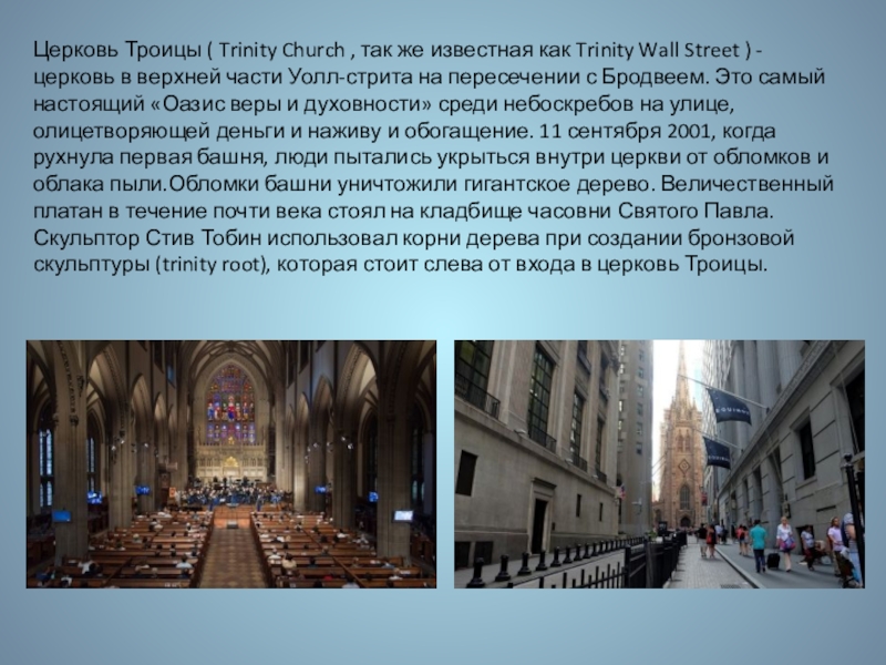 Wall Street ) - церковь в верхней части Уолл-стрита на пересечении с Бродвеем. Это самый настоящий «Оазис веры и духовности» среди небоскребов на улице, олицетворяющей деньги и наживу и обогащение. 11 сентября 2001, когда рухнула первая башня, люди пытались укрыться внутри церкви от обломков и облака пыли.Обломки башни уничтожили гигантское дерево. Величественный платан в течение почти века стоял на кладбище часовни Святого Павла. Скульптор Стив Тобин использовал корни дерева при создании бронзовой скульптуры (trinity root), которая стоит слева от входа в церковь Троицы.