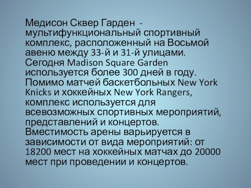 Слайд 7Медисон Сквер Гарден - мультифункциональный спортивный комплекс, расположенный на Восьмой авеню