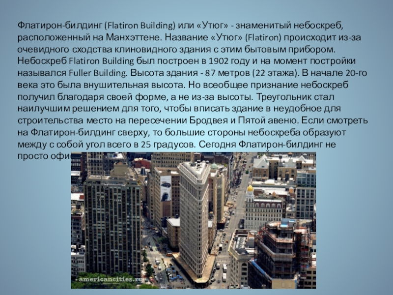 Слайд 38Флатирон-билдинг (Flatiron Building) или «Утюг» - знаменитый небоскреб, расположенный на Манхэттене.