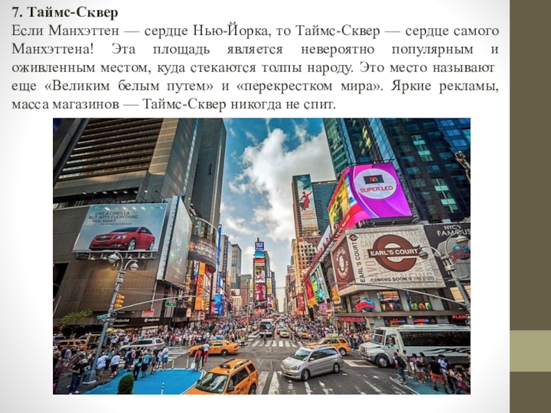 самого Манхэттена! Эта площадь является невероятно популярным и оживленным местом, куда стекаются толпы народу. Это место называют еще «Великим белым путем» и «перекрестком мира». Яркие рекламы, масса магазинов — Таймс-Сквер никогда не спит.