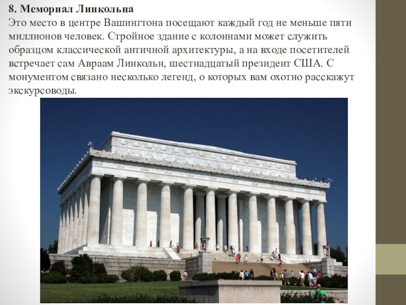 не меньше пяти миллионов человек. Стройное здание с колоннами может служить образцом классической античной архитектуры, а на входе посетителей встречает сам Авраам Линкольн, шестнадцатый президент США. С монументом связано несколько легенд, о которых вам охотно расскажут экскурсоводы.
