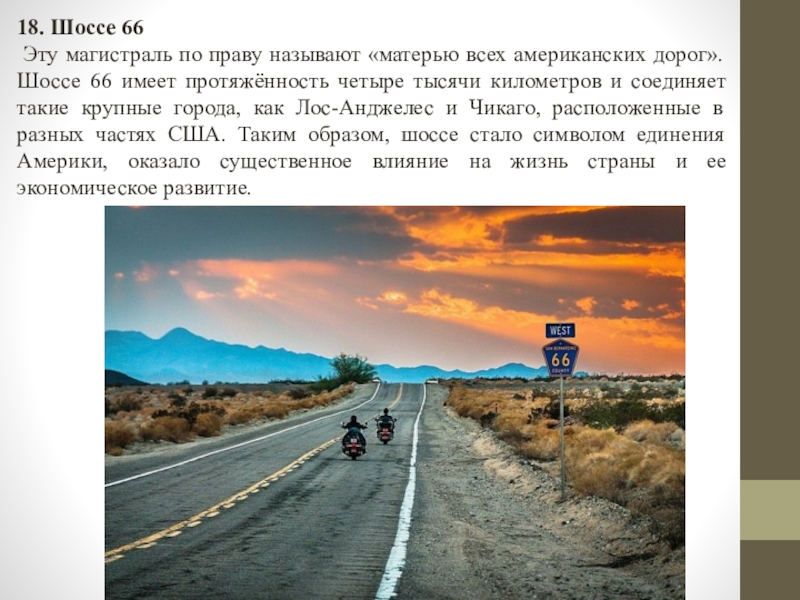 дорог». Шоссе 66 имеет протяжённость четыре тысячи километров и соединяет такие крупные города, как Лос-Анджелес и Чикаго, расположенные в разных частях США. Таким образом, шоссе стало символом единения Америки, оказало существенное влияние на жизнь страны и ее экономическое развитие.