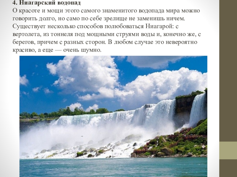 мира можно говорить долго, но само по себе зрелище не заменишь ничем. Существует несколько способов полюбоваться Ниагарой: с вертолета, из тоннеля под мощными струями воды и, конечно же, с берегов, причем с разных сторон. В любом случае это невероятно красиво, а еще — очень шумно.