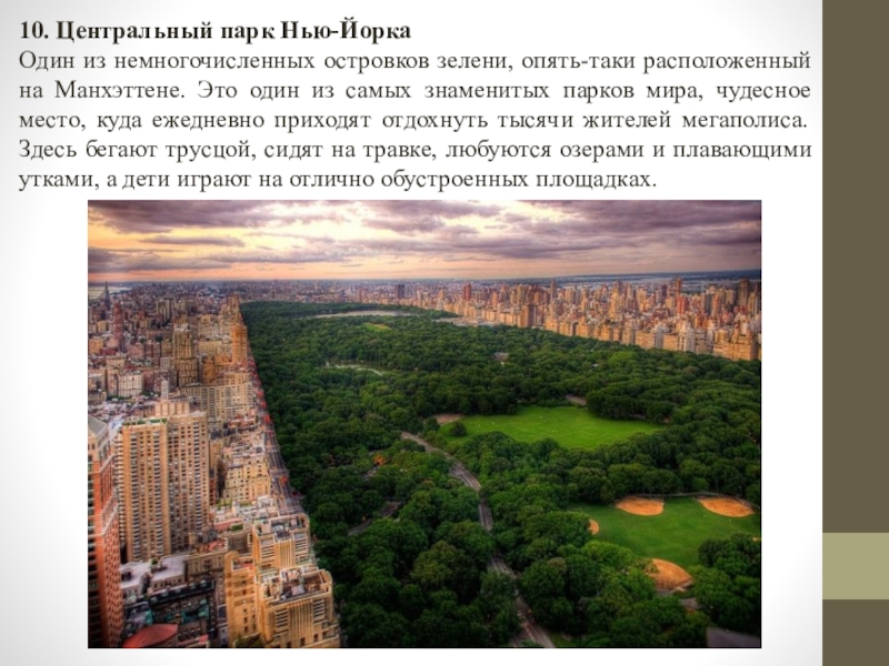 на Манхэттене. Это один из самых знаменитых парков мира, чудесное место, куда ежедневно приходят отдохнуть тысячи жителей мегаполиса. Здесь бегают трусцой, сидят на травке, любуются озерами и плавающими утками, а дети играют на отлично обустроенных площадках.