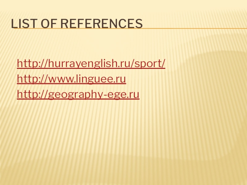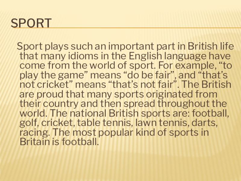 many idioms in the English language have come from the world of sport. For example, “to play the game” means “do be fair”, and “that’s not cricket” means “that’s not fair”. The British are proud that many sports originated from their country and then spread throughout the world. The national British sports are: football, golf, cricket, table tennis, lawn tennis, darts, racing. The most popular kind of sports in Britain is football.
