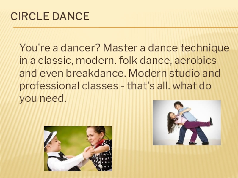 a classic, modern. folk dance, aerobics and even breakdance. Modern studio and professional classes - that's all. what do you need.