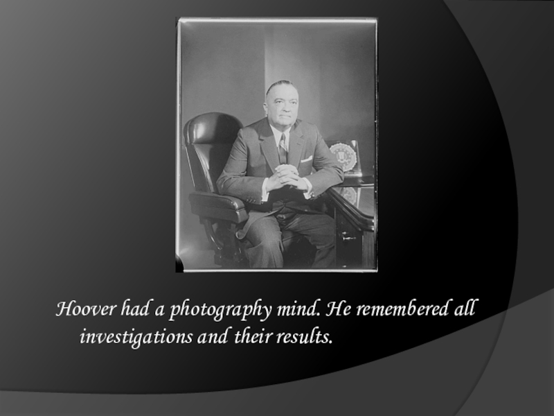 Слайд 5Hoover had a photography mind. He remembered all investigations and their