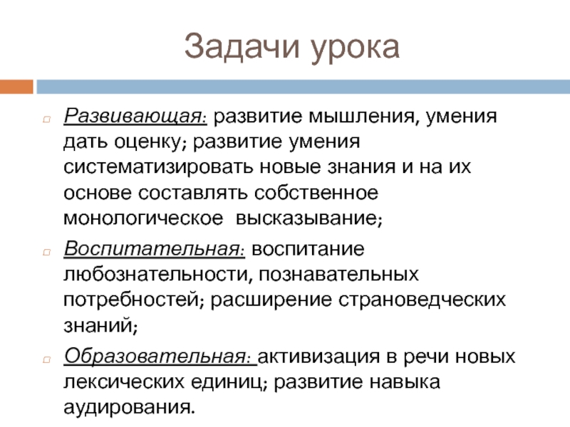Задачи урокаРазвивающая: развитие мышления, умения дать оценку; развитие умения систематизировать новые знания и на их основе составлять собственное монологическое высказывание;Воспитательная: воспитание любознательности, познавательных потребностей; расширение страноведческих знаний; Образовательная: активизация в речи новых лексических единиц; развитие навыка