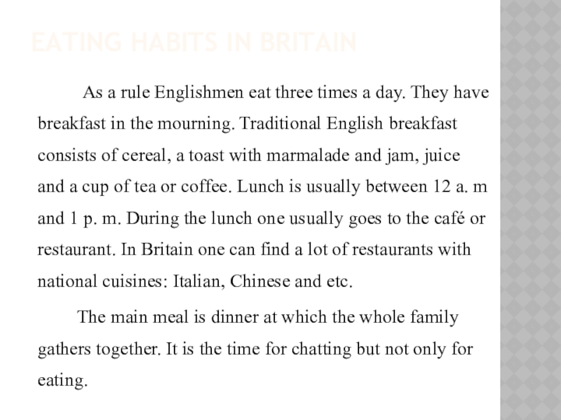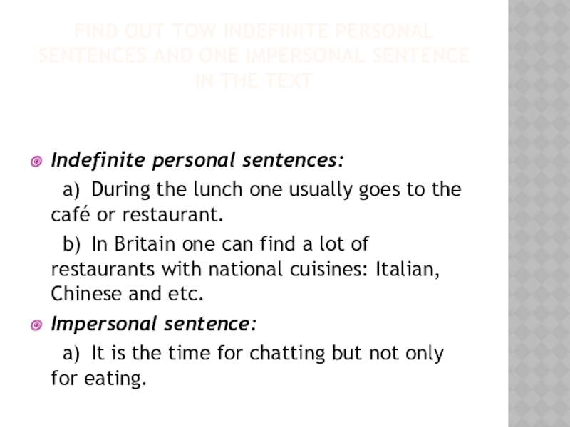 b) In Britain one can find a lot of restaurants with national cuisines: Italian, Chinese and etc.