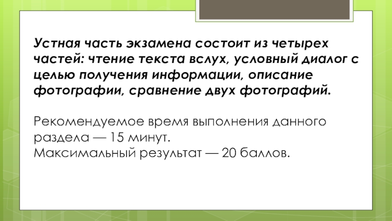 Слайд 2Устная часть экзамена состоит из четырех частей: чтение текста вслух, условный