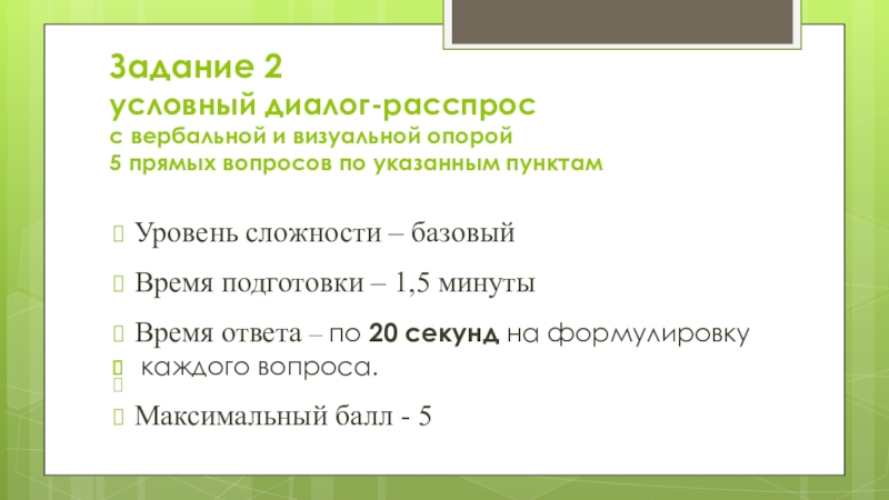 и получить информацию по ряду интересующих вас вопросов при помощи ключевых слов. Обратите внимание на то, что в задании вас просят использовать только прямые вопросы. Между вопросами будет пауза в 20 секунд, во время которой (если вы быстро задали вопрос и у вас осталось время) вы или спокойно ждете слов диктора, сообщающего о следующем вопросе, или, при необходимости, исправляете свой вопрос. Картинка, находящаяся рядом с заданием, дана для того, чтобы вы более наглядно представили себе ситуацию и организацию, в которую вы обращаетесь. Описывать ее НЕ НАДО.