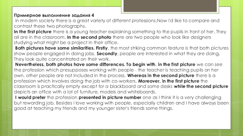 Пункт номер 4 плана может помочь не только со вступлением, но и со значимыми общими чертами и различиями, т.к. они тоже связаны с основной тематикой фотографий. При ответе на четвертый пункт плана достаточно перестроить порядок слов указанной в плане фразы