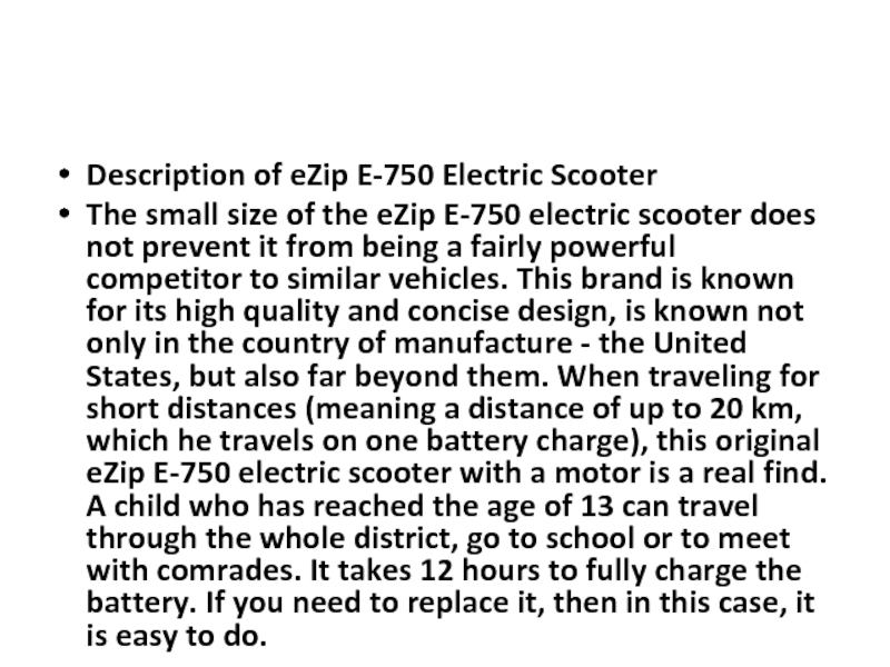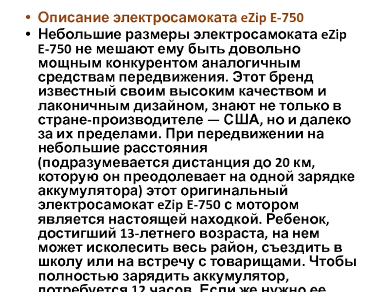 E-750 electric scooter does not prevent it from being a fairly powerful competitor to similar vehicles. This brand is known for its high quality and concise design, is known not only in the country of manufacture - the United States, but also far beyond them. When traveling for short distances (meaning a distance of up to 20 km, which he travels on one battery charge), this original eZip E-750 electric scooter with a motor is a real find. A child who has reached the age of 13 can travel through the whole district, go to school or to meet with comrades. It takes 12 hours to fully charge the battery. If you need to replace it, then in this case, it is easy to do.