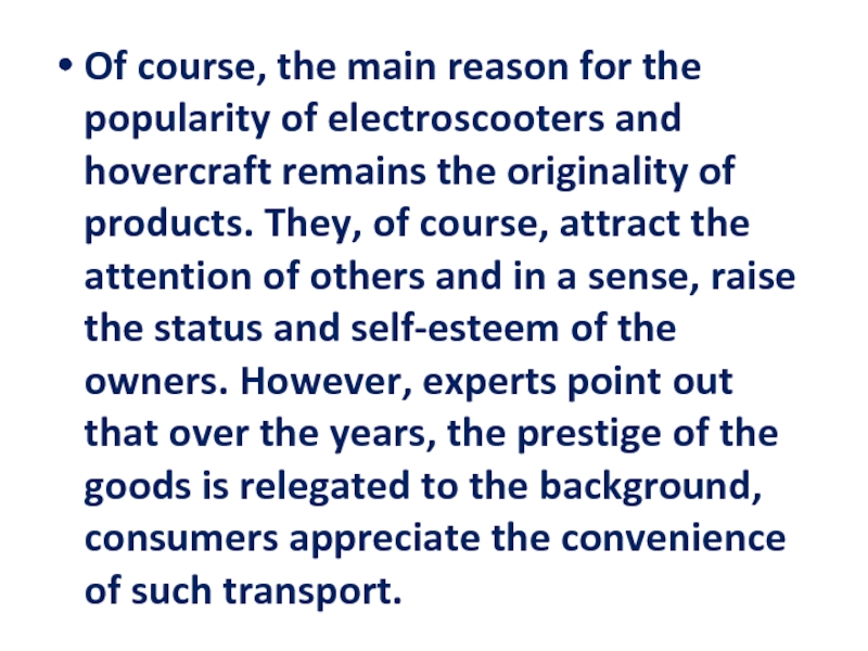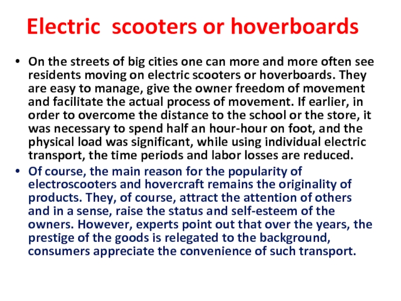 Of course, the main reason for the popularity of electroscooters and hovercraft remains the originality of products. They, of course, attract the attention of others and in a sense, raise the status and self-esteem of the owners. However, experts point out that over the years, the prestige of the goods is relegated to the background, consumers appreciate the convenience of such transport.