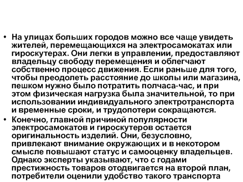 электросамокатах или гироскутерах. Они легки в управлении, предоставляют владельцу свободу перемещения и облегчают собственно процесс движения. Если раньше для того, чтобы преодолеть расстояние до школы или магазина, пешком нужно было потратить полчаса-час, и при этом физическая нагрузка была значительной, то при использовании индивидуального электротранспорта и временные сроки, и трудопотери сокращаются.