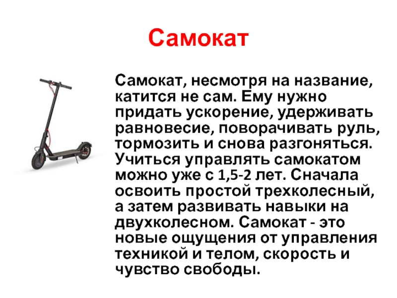 Самокат, несмотря на название, катится не сам. Ему нужно придать ускорение,
