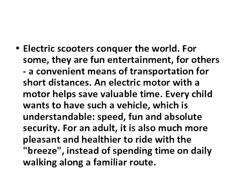 Слайд 16Electric scooters conquer the world. For some, they are fun entertainment,