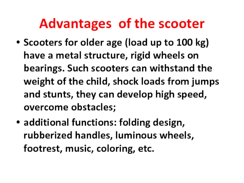kg) have a metal structure, rigid wheels on bearings. Such scooters can withstand the weight of the child, shock loads from jumps and stunts, they can develop high speed, overcome obstacles;