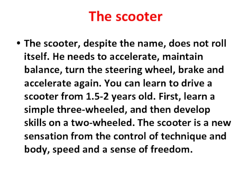 needs to accelerate, maintain balance, turn the steering wheel, brake and accelerate again. You can learn to drive a scooter from 1.5-2 years old. First, learn a simple three-wheeled, and then develop skills on a two-wheeled. The scooter is a new sensation from the control of technique and body, speed and a sense of freedom.