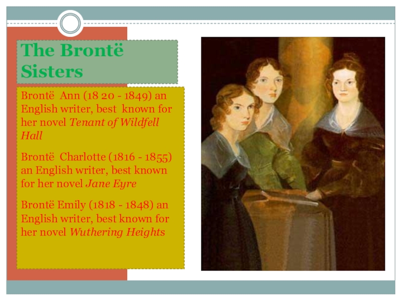The Brontё SistersBrontё Ann (18 20 - 1849) an English writer, best known for her novel Tenant