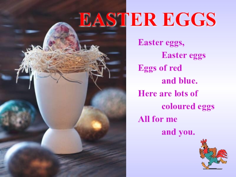 On Easter Sunday children get chocolate Easter eggs or rabbits. You can buy them at any sweet shop in the weeks before Easter.