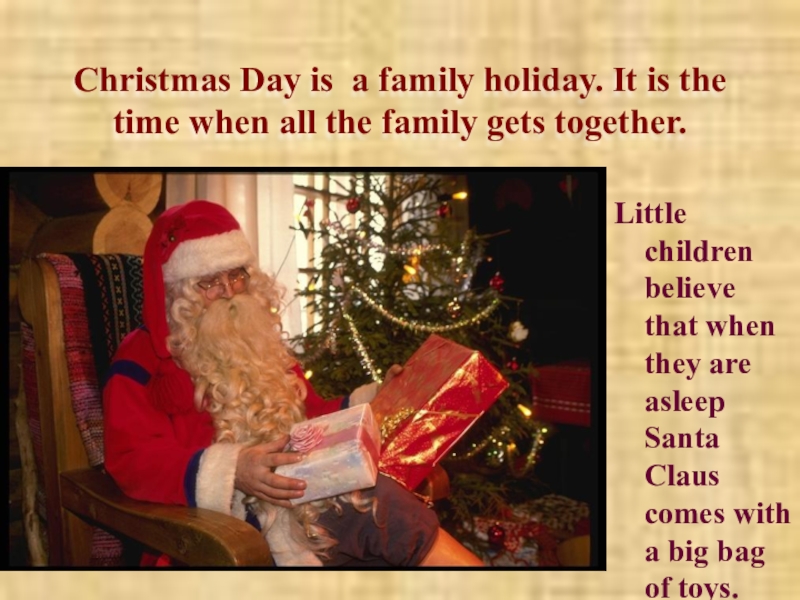 Little children believe that when they are asleep Santa Claus comes with a big bag of toys.
