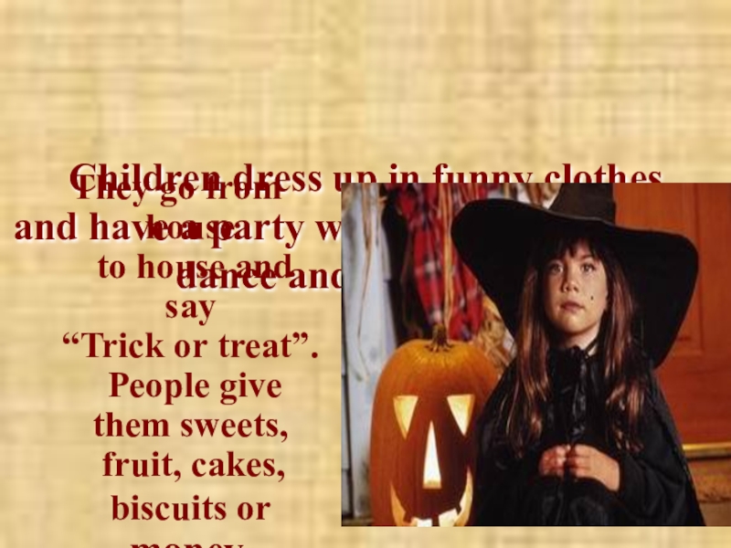 People put pump-kins on the window-sills. They draw eyes, noses and mouths on the pumpkins and put candles into them. So the pumpkins look like a face.