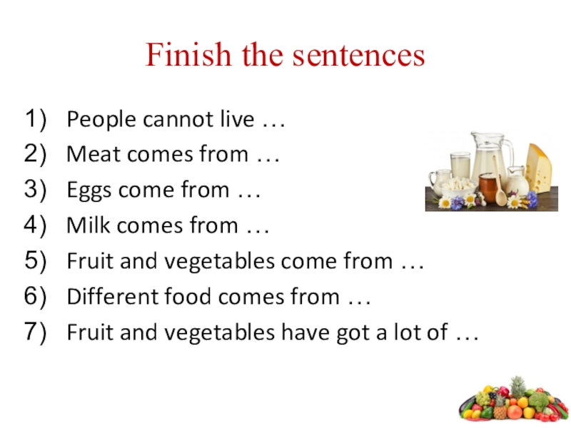 Finish the sentencesPeople cannot live …Meat comes from …Eggs come from …Milk comes from …Fruit and vegetables