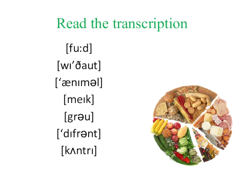 Read the transcription[fu:d][wı’ðaut][‘ænıməl][meık][grəu][‘dıfrənt][kʌntrı]