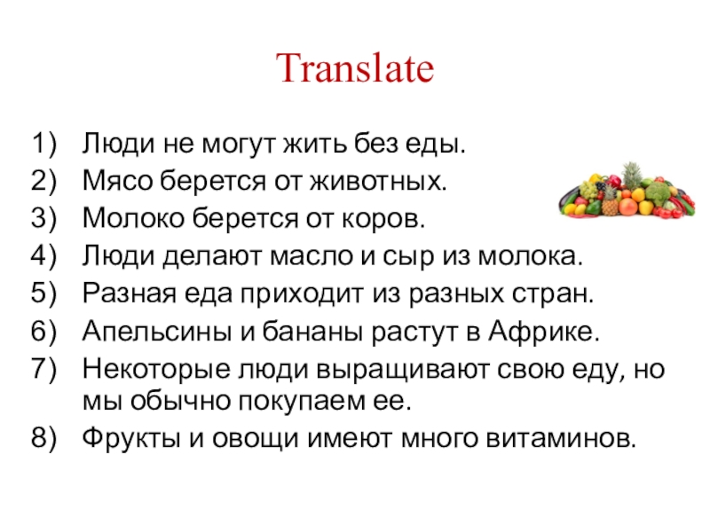 TranslateЛюди не могут жить без еды.Мясо берется от животных.Молоко берется от коров.Люди делают масло и сыр из