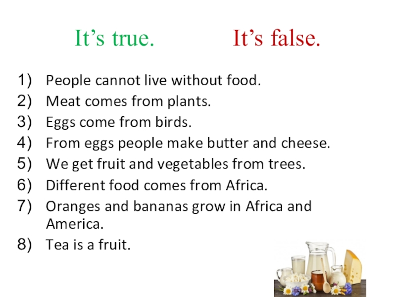 It’s true. 				It’s false.People cannot live without food.Meat comes from plants.Eggs come from birds.From eggs people make